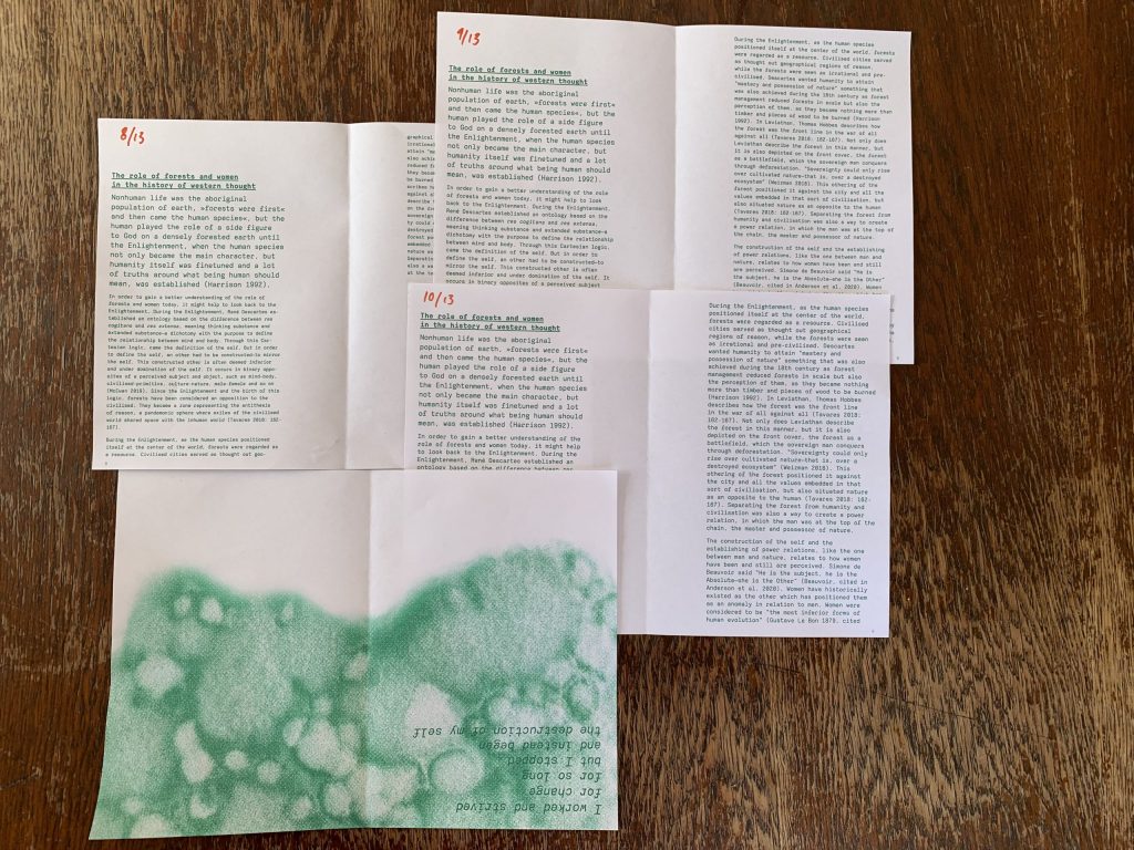 The modern patriarchal civilisation is a place where there are many constructed norms that are building up an invisible framework, a social contract of constraint, specially designed for women. These constraints are positioning women in a one-sided role, that is so small and hard to fit in for so many. The forest on the other hand is a place of radical relationality, connecting all living organisms in it, growing complex networks underground to become more resilient, together, as a whole.