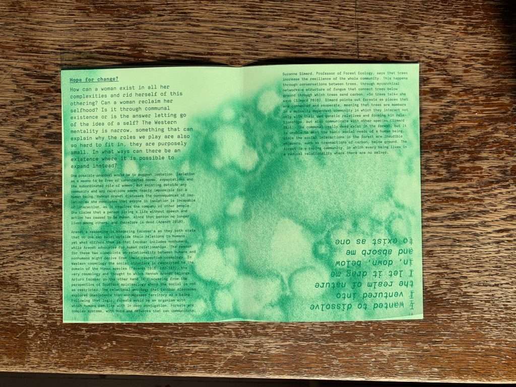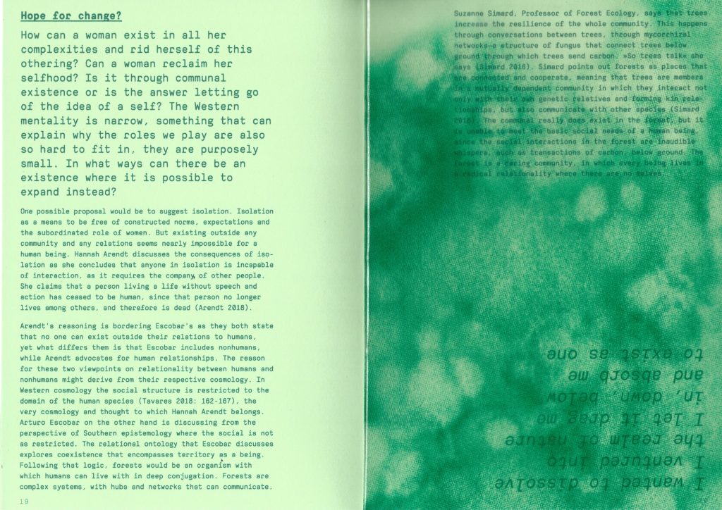 Can the forest be a place for women to exist and to be free of any constraints and to be complete? Can women and the forest exist in symbiosis in a reality where it is bearable to persist? Is it possible to dismantle the self and exist in a fully intermutual relationship in a nonhuman formation?