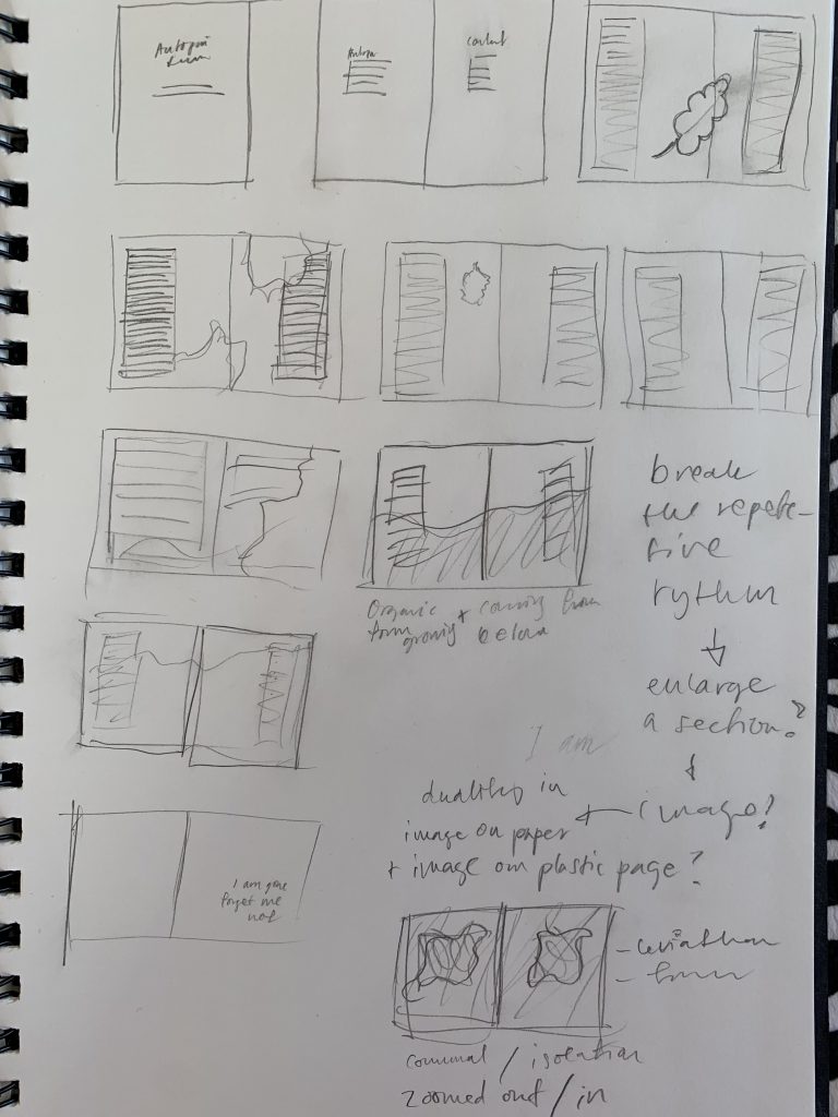 The visual framework was important. I wanted to visually re-create this uncomfortable invisible framework that the text discusses, that we involuntarily relate to. I set up a five column grid, and let the margins only be 1 cm. Making the pages feel a bit cramped.