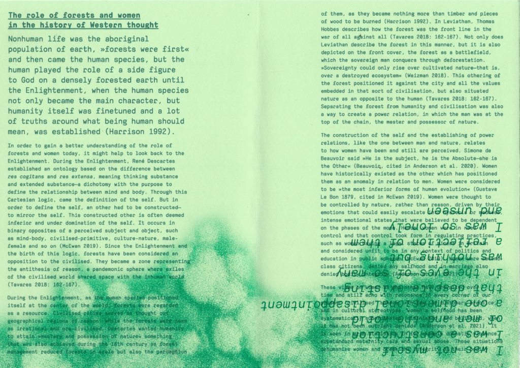 In order to gain a better understanding of the role of forests and women today, it might help to look back to the Enlightenment. During the Enlightenment, René Descartes established an ontology based on the difference between res cogitans and res extensa, meaning thinking substance and extended substance–a dichotomy with the purpose to define the relationship between mind and body. Through this Cartesian logic, came the definition of the self. But in order to define the self, an ‘other’ had to be constructed–to mirror the self. This constructed ‘other’ is often deemed inferior and under domination of the self. It occurs in binary opposites of a perceived subject and object, such as mind-body, civilised-primitive, culture-nature, male-female and so on (McEwan 2019). Since the Enlightenment and the birth of this logic, forests have been considered an opposition to the civilised. They became a zone representing the antithesis of reason, a pandemonic sphere where exiles of the civilised world shared space with the inhuman world (Tavares 2018: 162-167).